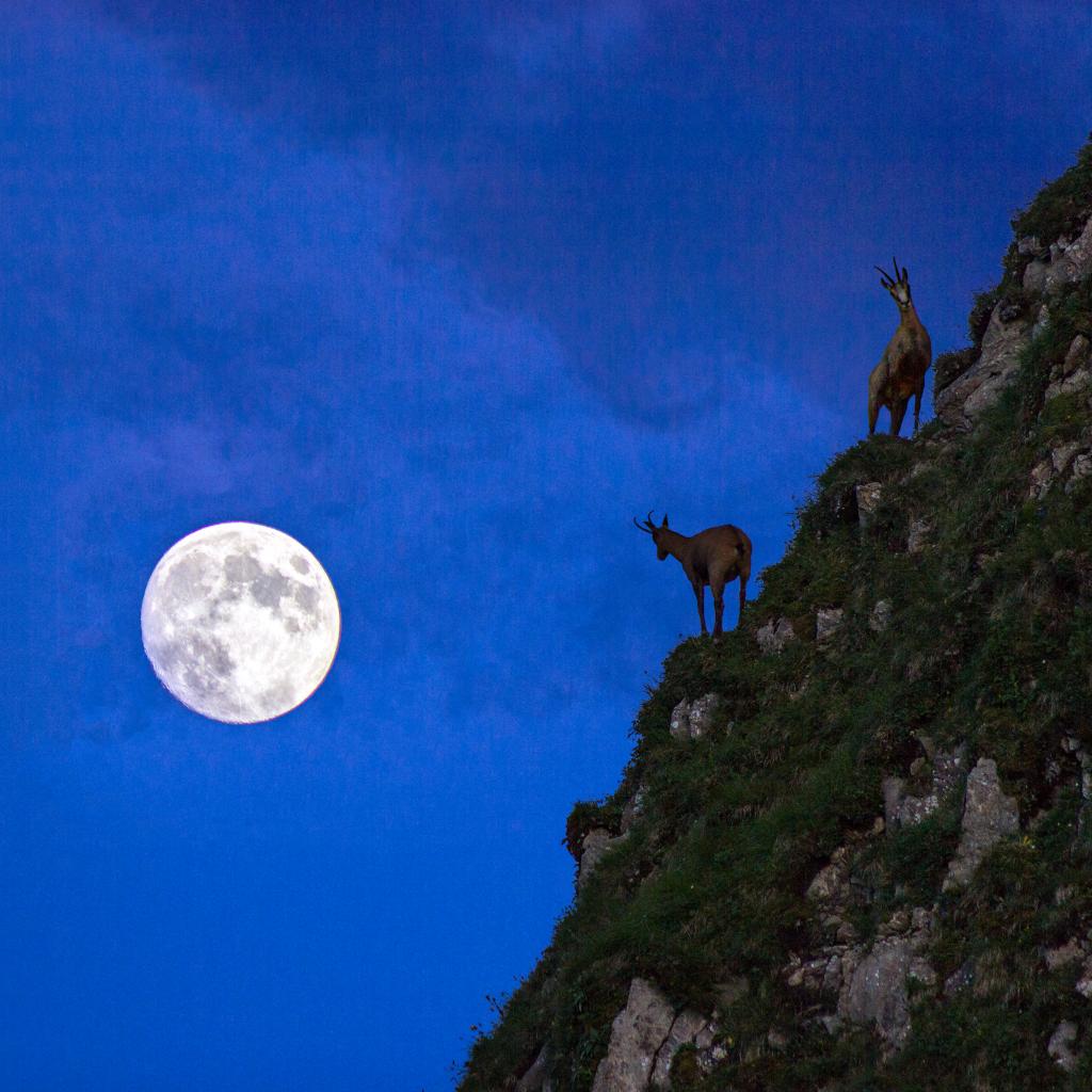 Обои Горные козлы на фоне луны