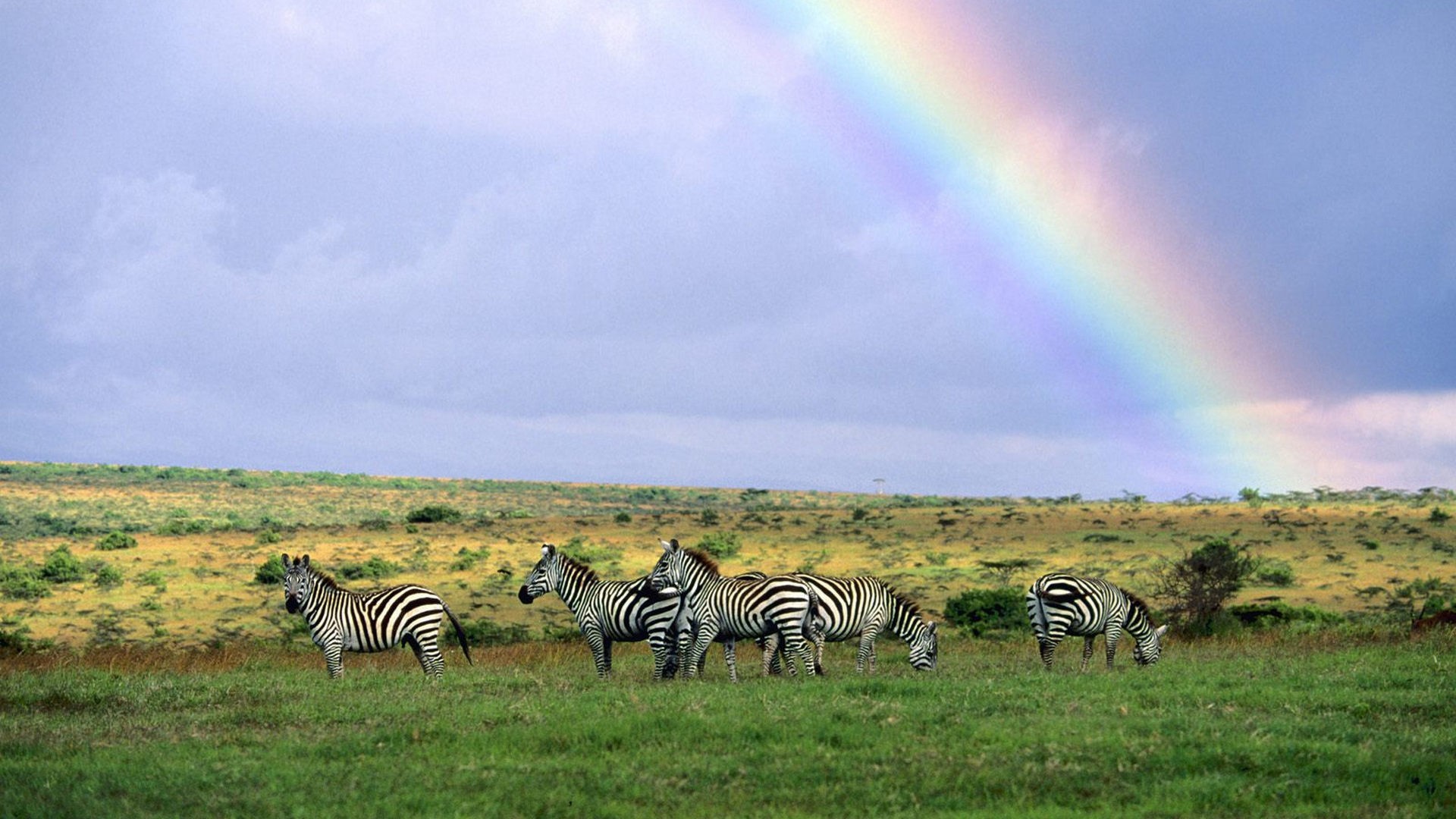 Обои Зебры пасутся под радугой