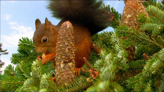Обои Белка собирает шишки на ёлке