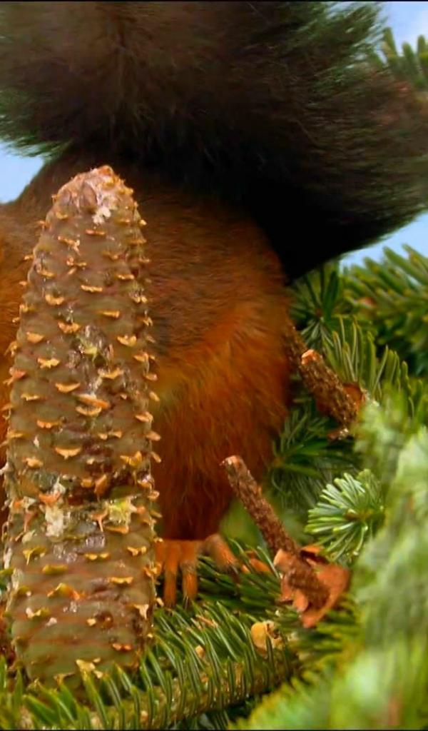 Обои Белка собирает шишки на ёлке