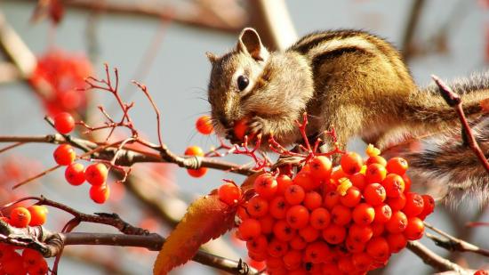 Обои Бурундук кушает рябину
