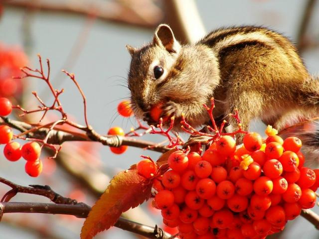 Обои Бурундук кушает рябину