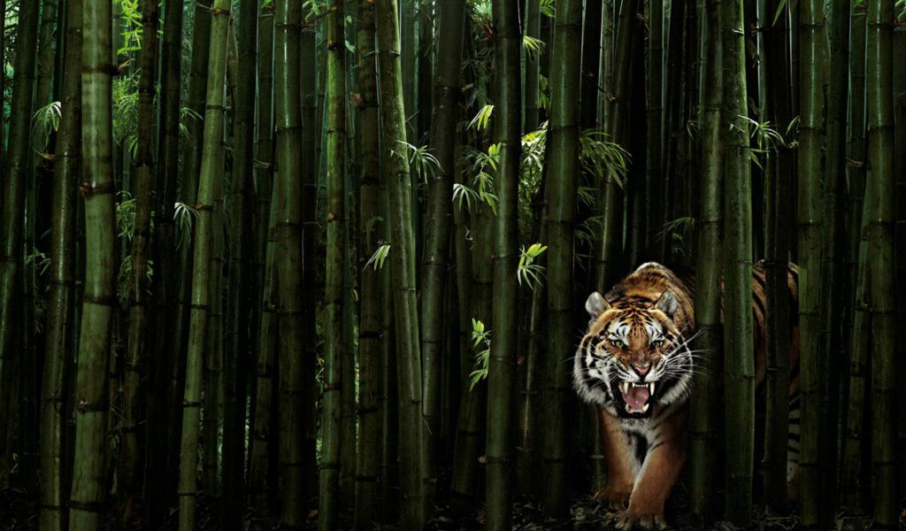 Обои Тигр в бамбуковом лесу