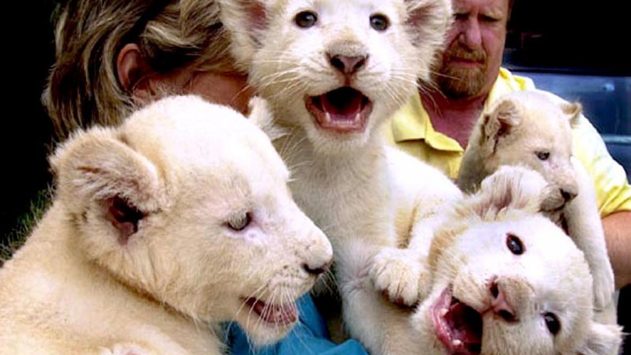 Обои Львята альбиносы на водопое