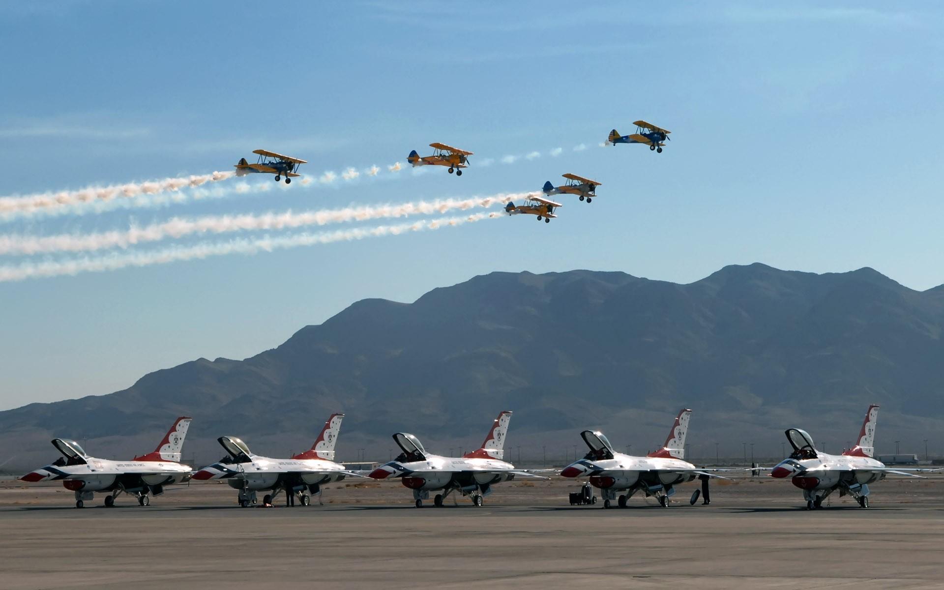 Wallpaper Light single-engine plane flies over a military base