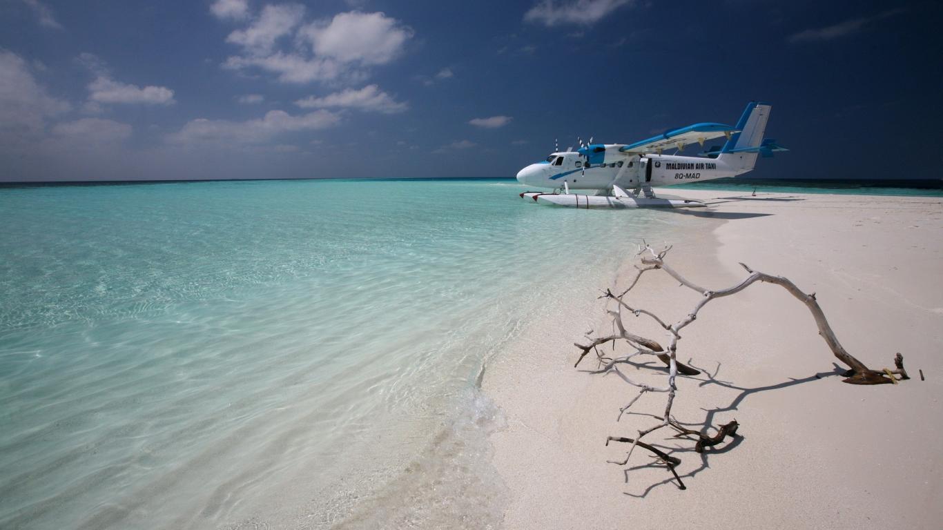 Wallpaper Plane landed on the water at the white beach