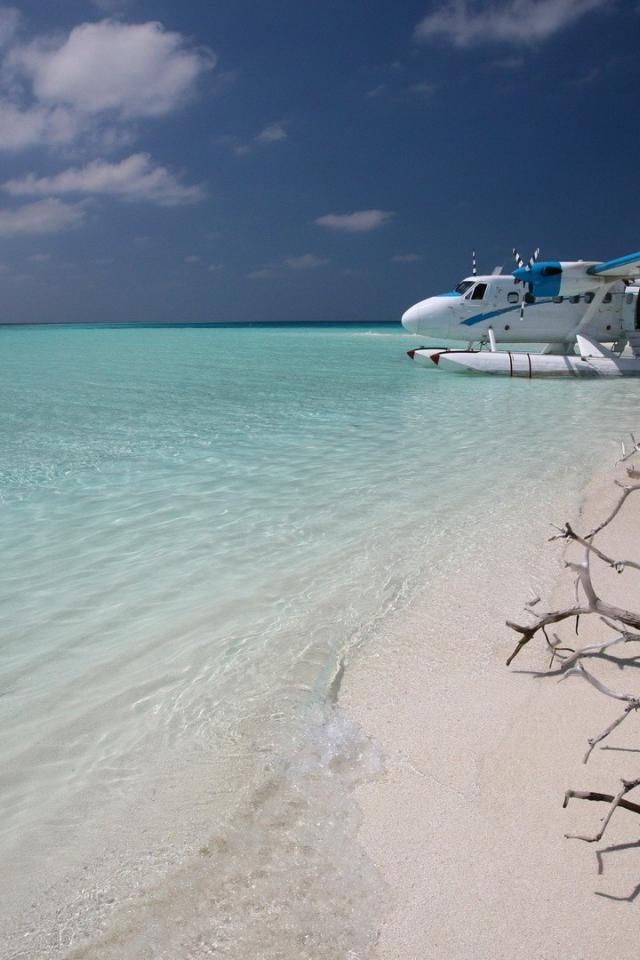 Wallpaper Plane landed on the water at the white beach
