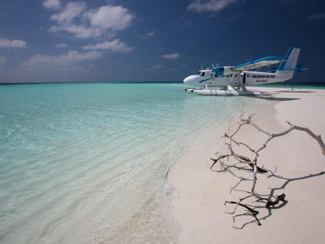 Wallpaper Plane landed on the water at the white beach