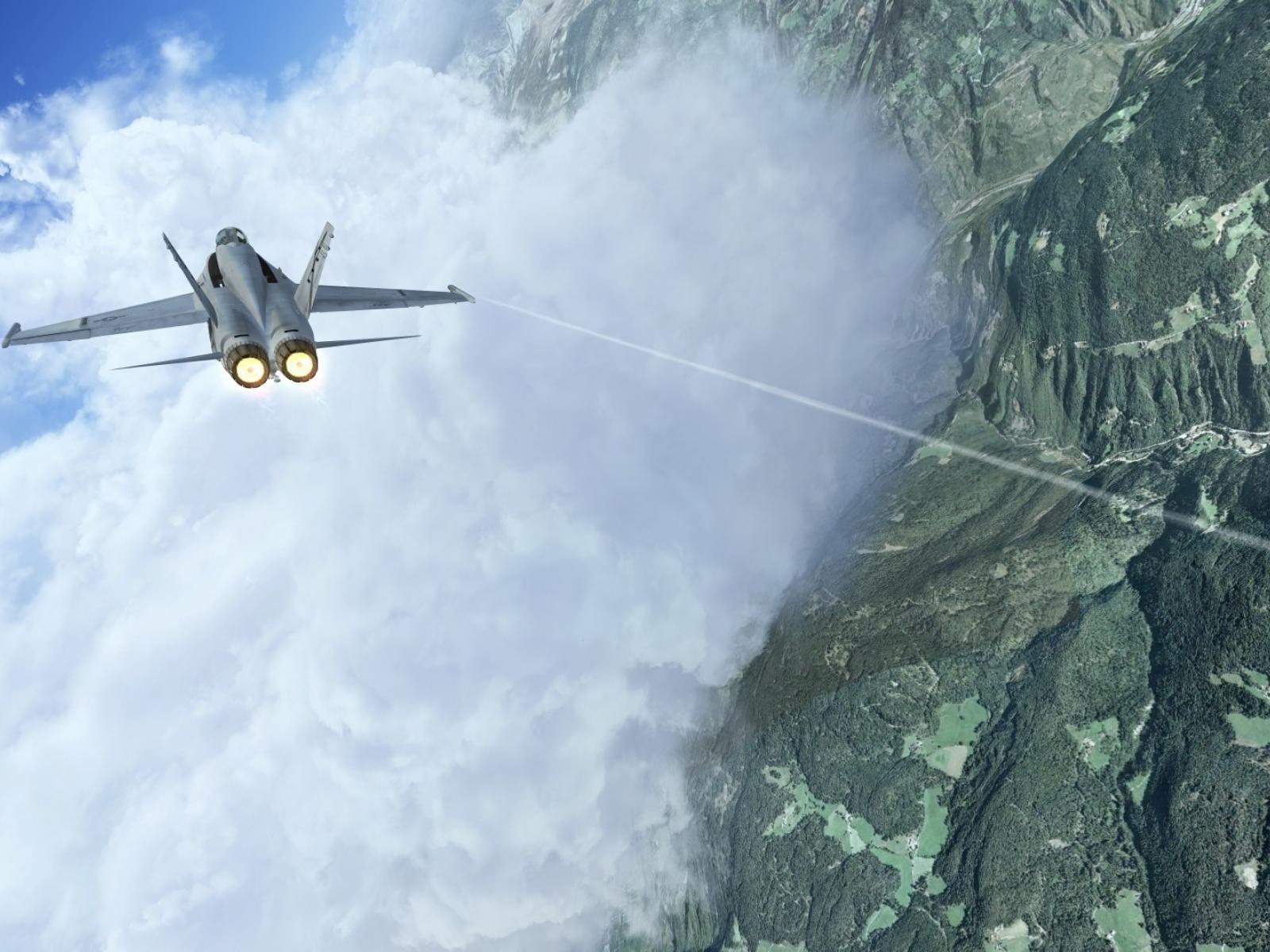 Wallpaper Fighter flies through a cloud in the mountains