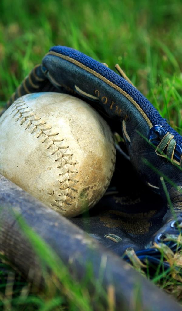 Wallpaper Baseball bat, glove and ball lie on the green grass.
