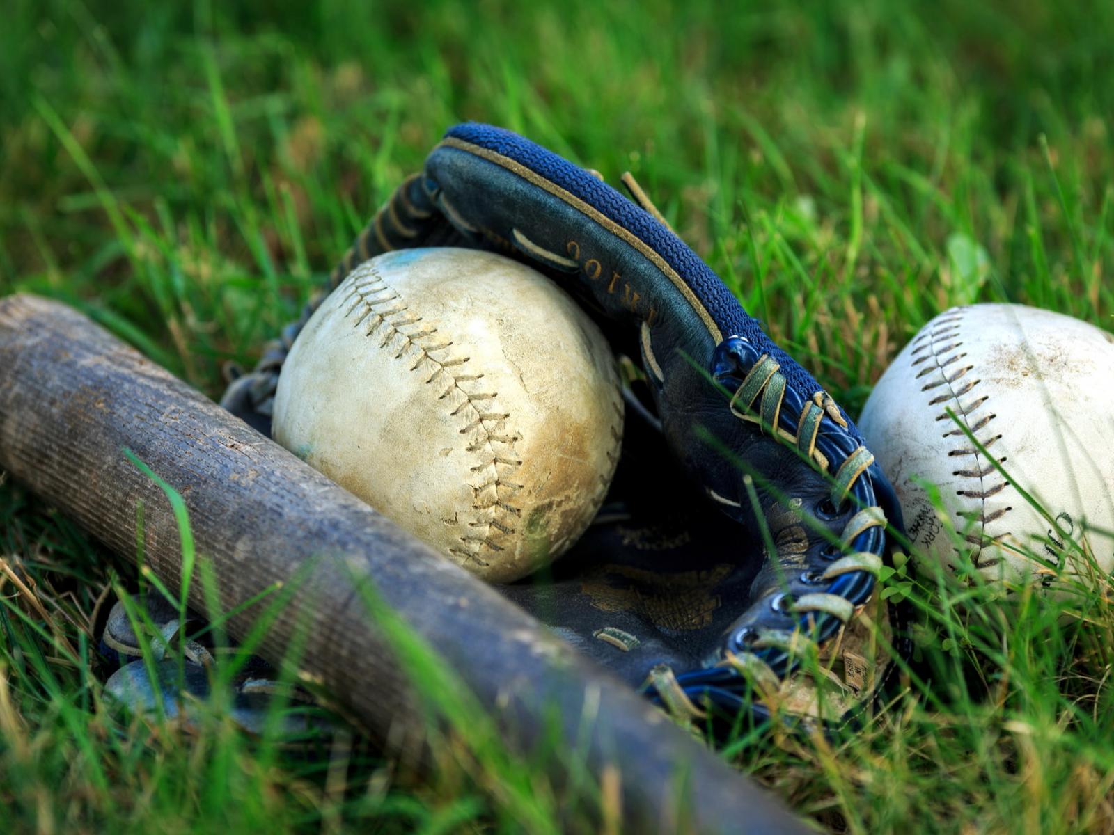Wallpaper Baseball bat, glove and ball lie on the green grass.