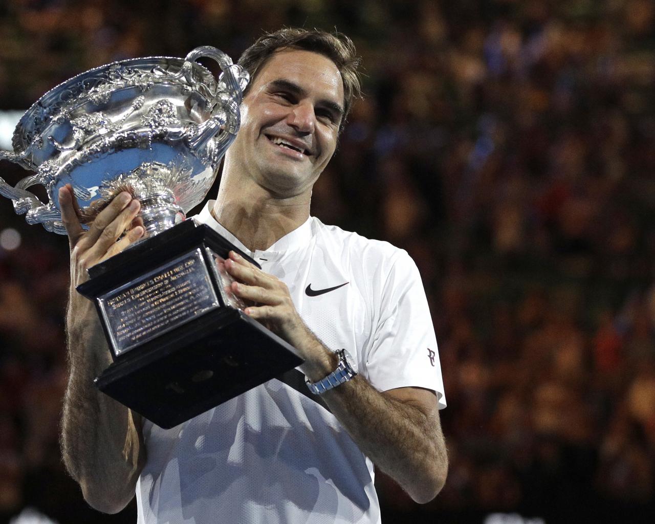 Wallpaper Smiling Swiss tennis player Roger Federer with a prize in his hands