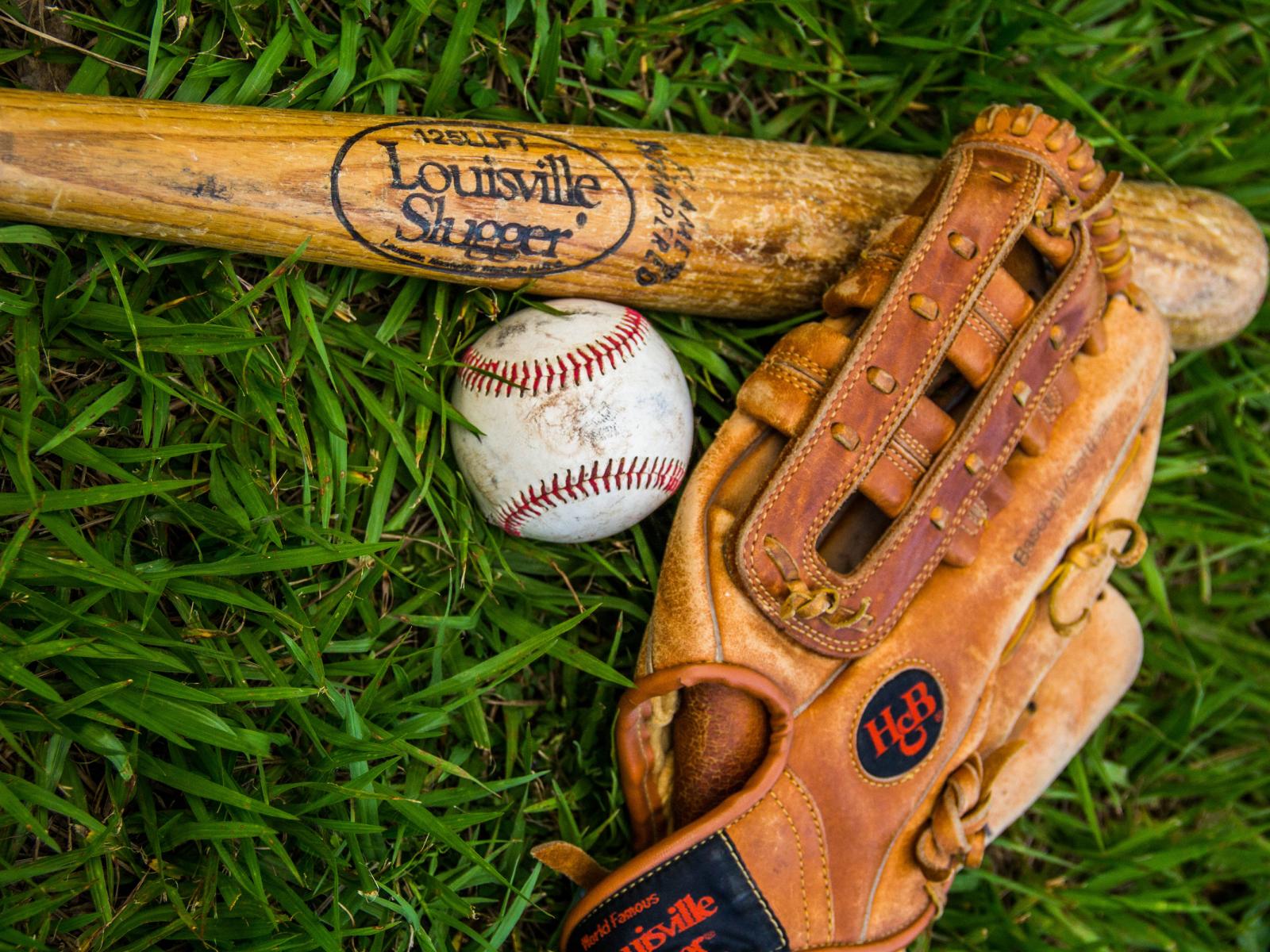 Wallpaper Baseball bat, glove and ball lie on the green grass.