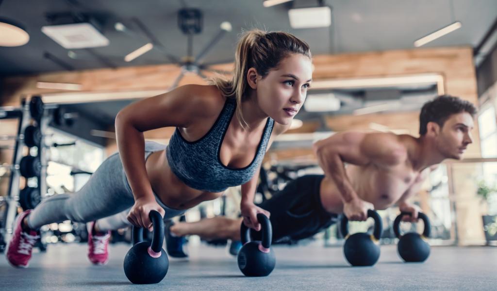 Wallpaper The guy and the girl are engaged with weights in the gym