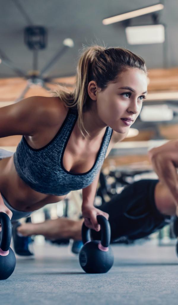 Wallpaper The guy and the girl are engaged with weights in the gym