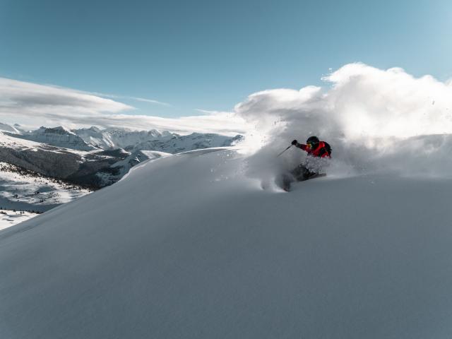 Wallpaper Young guy skiing on a snowy mountain in the rays of the sun