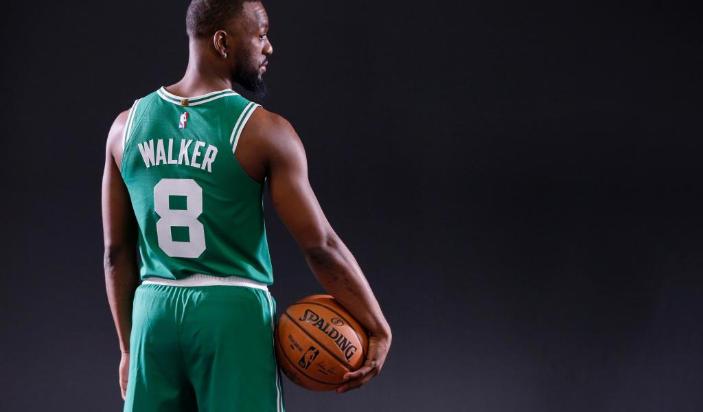 Wallpaper American basketball player Kemba Walker in uniform with the ball
