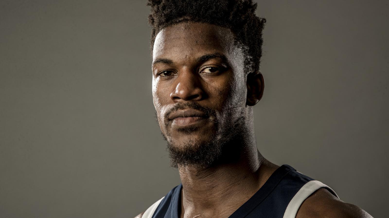 Wallpaper American basketball player Jimmy Butler on a gray background