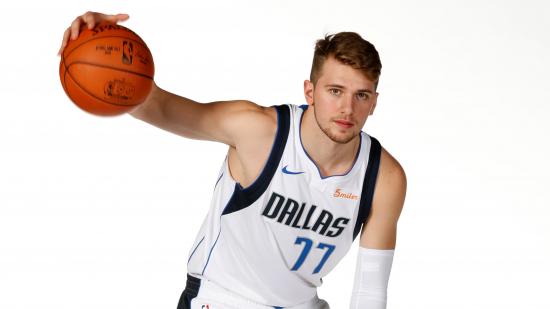 Wallpaper Slovenian basketball player Luka Doncic on a white background with a ball