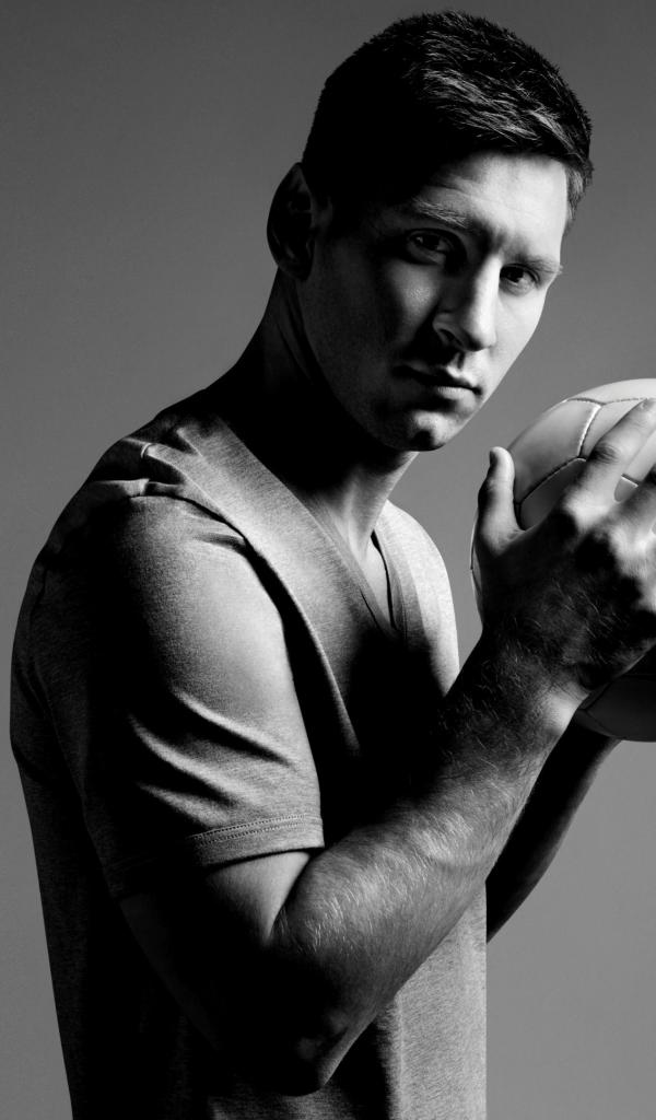 Wallpaper Football player Lionel Messi with the ball in his hands black and white photo