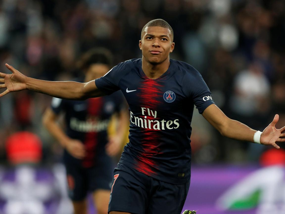 Wallpaper French footballer Kilian Mbappe runs across the field