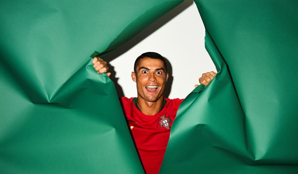 Wallpaper Funny face of football player Cristiano Ronaldo on a green background