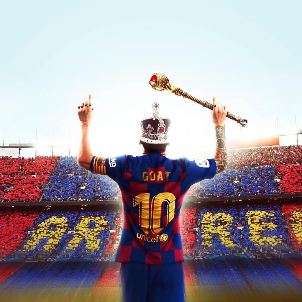 Wallpaper Football player Lionel Messi in the crown with a scepter in the stadium