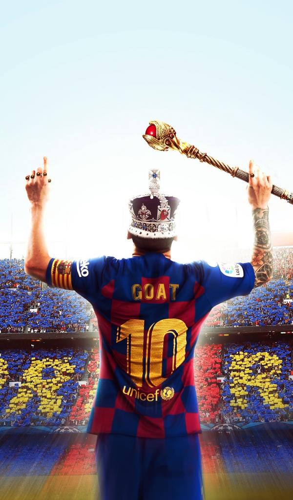 Wallpaper Football player Lionel Messi in the crown with a scepter in the stadium