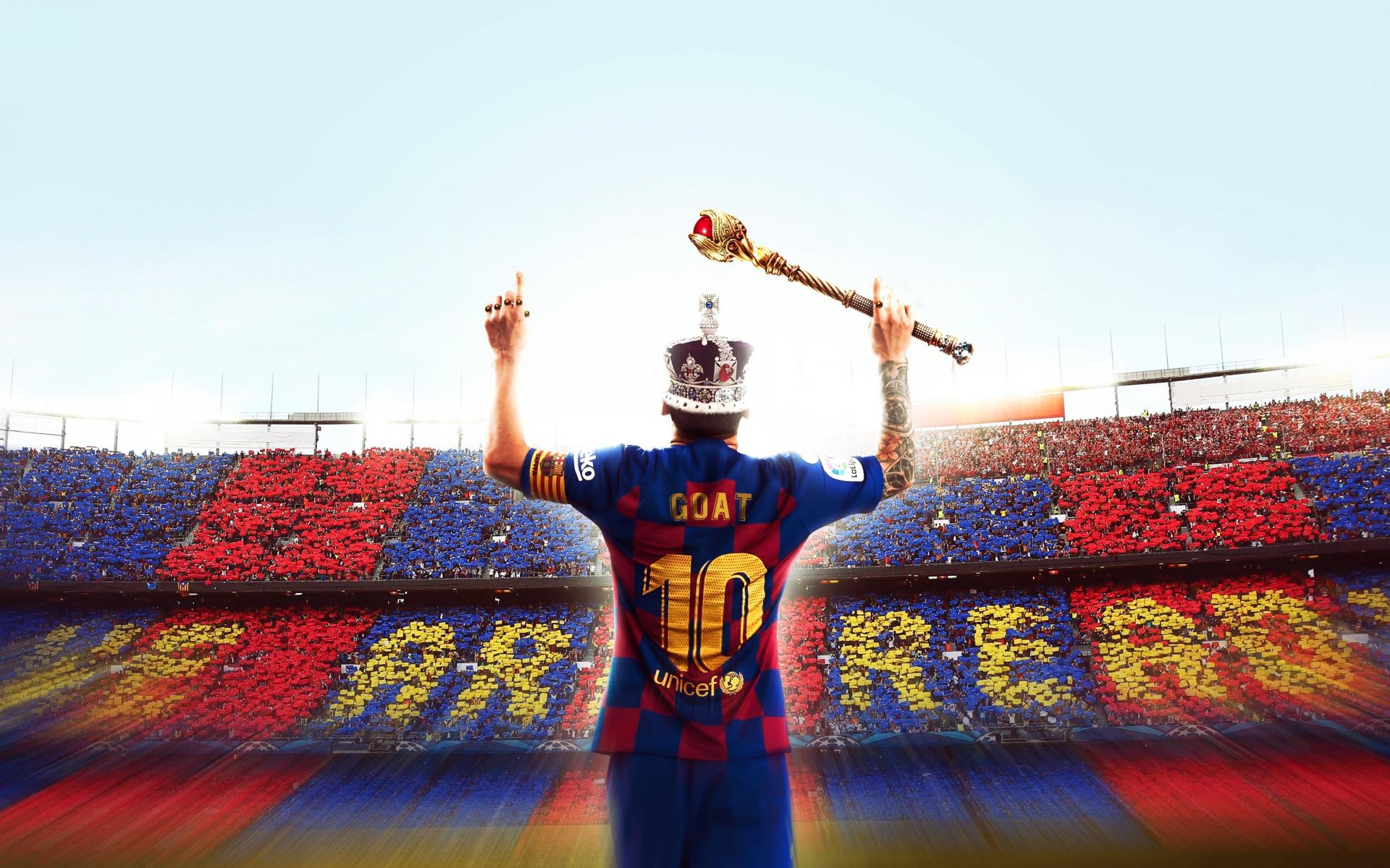 Wallpaper Football player Lionel Messi in the crown with a scepter in the stadium