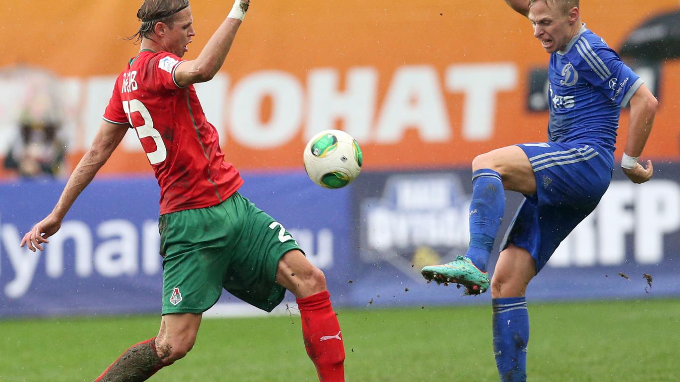 Wallpaper the halfback of Moscow Lokomotiv Vitaliy Denisov is fighting for the ball