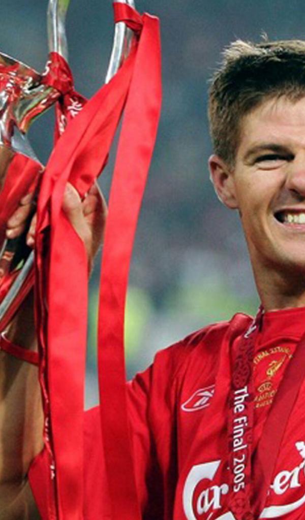 Wallpaper The football player of Liverpool Steven Gerrard with his own trophy