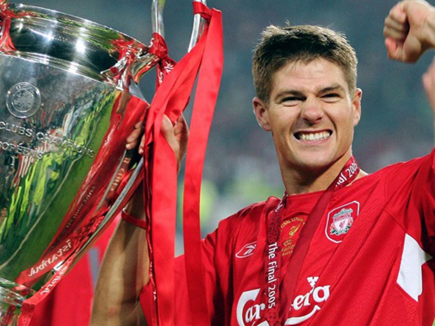 Wallpaper The football player of Liverpool Steven Gerrard with his own trophy
