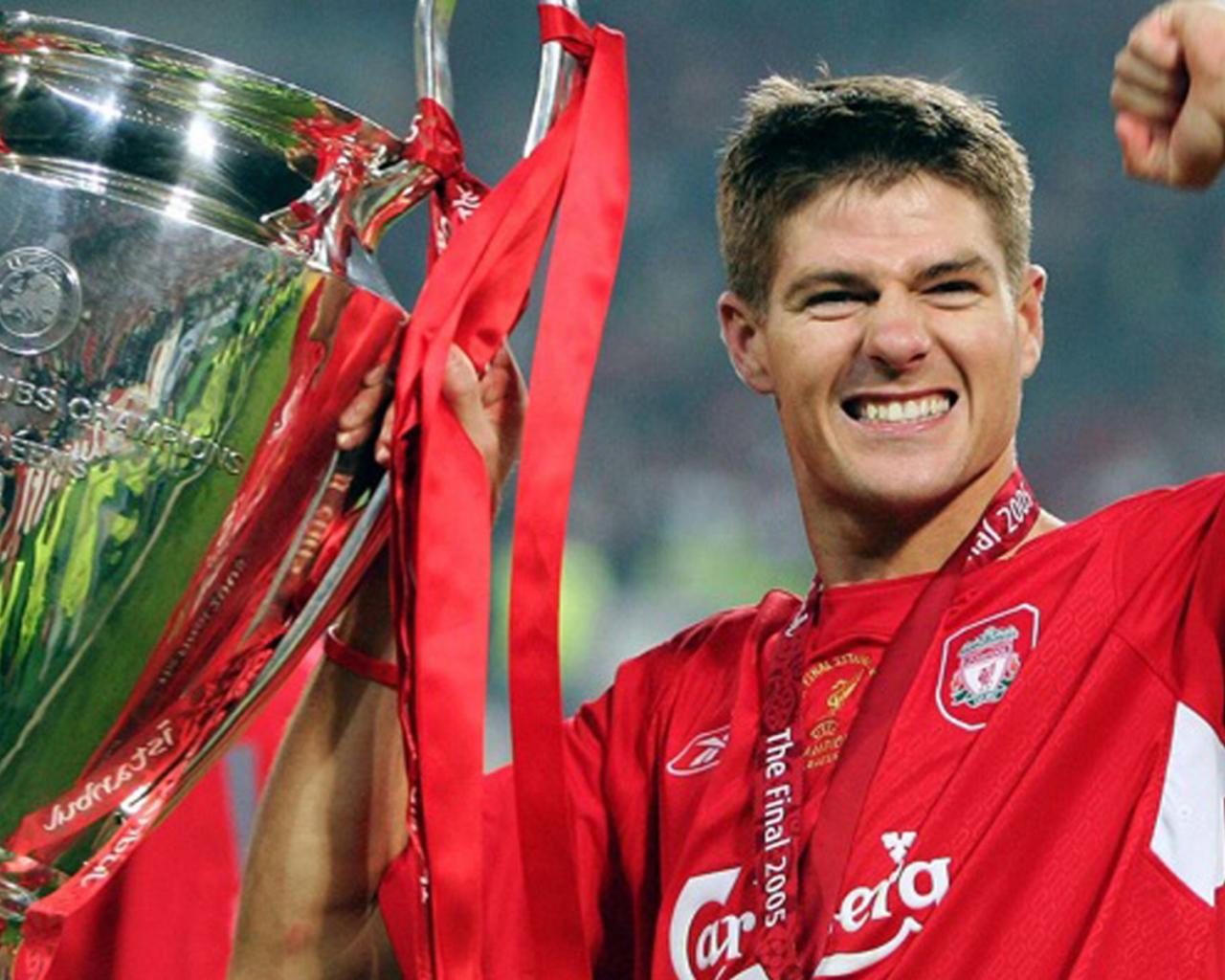 Wallpaper The football player of Liverpool Steven Gerrard with his own trophy