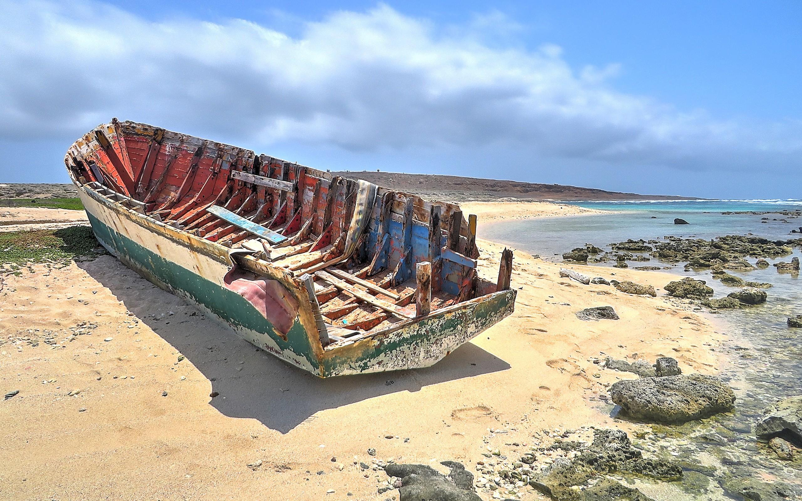 Wallpaper The skeleton of a boat on the beach in Aruba