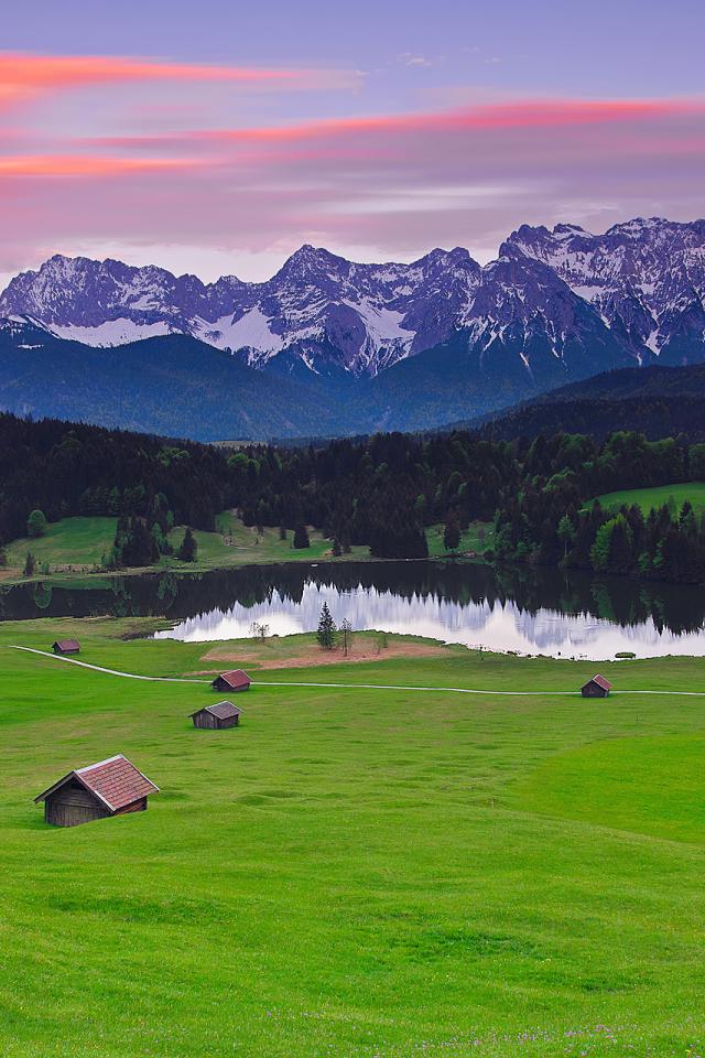 Wallpaper Lake, Snow-capped mountains, Green grass, Reflection, Relax