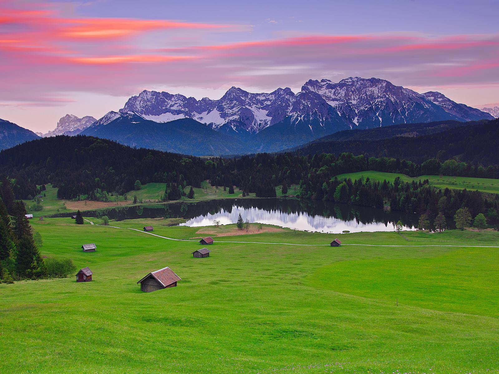 Wallpaper Lake, Snow-capped mountains, Green grass, Reflection, Relax