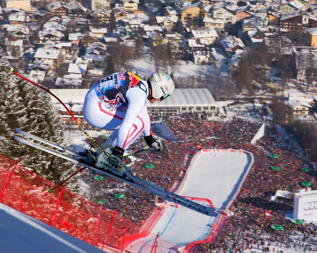 Wallpaper Skier on the road in the resort of Kitzbuehel, Austria