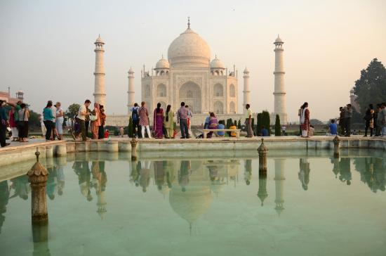 Wallpaper Tourists on the background of the mausoleum mosque Taj Mahal in Agra