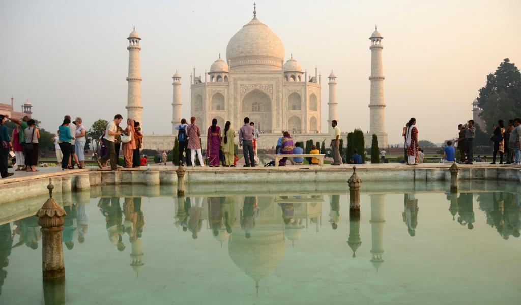 Wallpaper Tourists on the background of the mausoleum mosque Taj Mahal in Agra