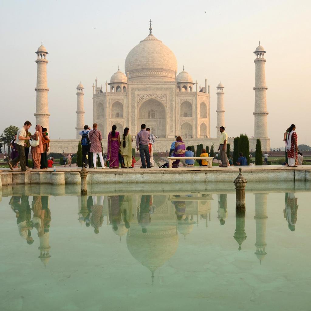 Wallpaper Tourists on the background of the mausoleum mosque Taj Mahal in Agra
