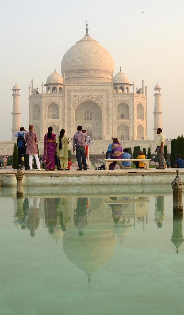 Wallpaper Tourists on the background of the mausoleum mosque Taj Mahal in Agra