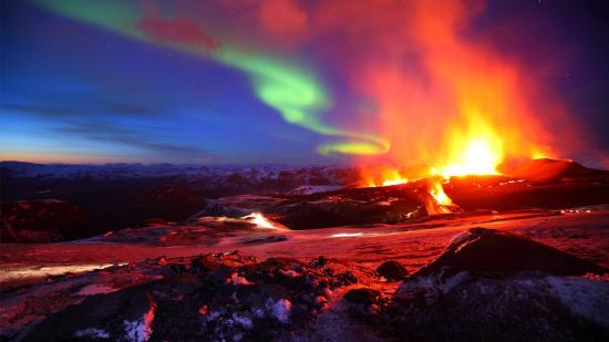 Wallpaper Eruption and the northern lights in one photo. Iceland