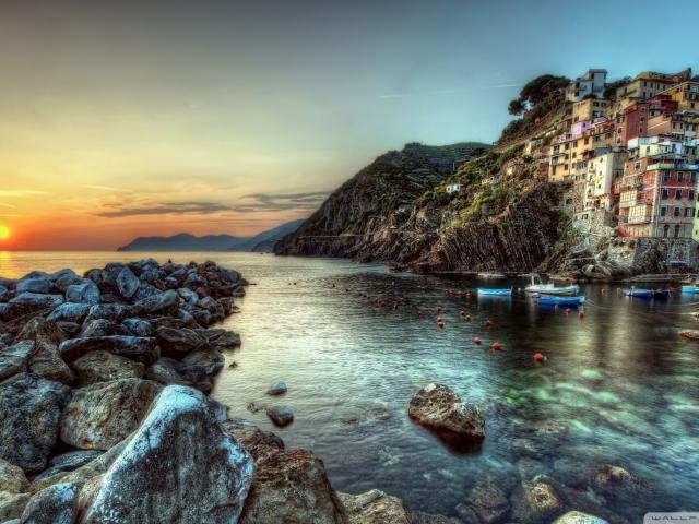 Wallpaper Seashore at sunset, the resort Cinque Terre in Italy