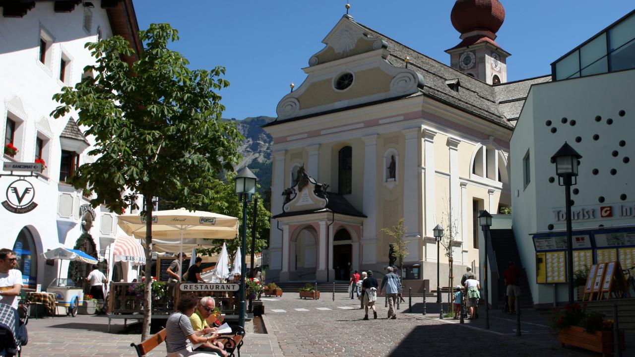 Wallpaper Church on a background of mountains in Ortisei, Italy