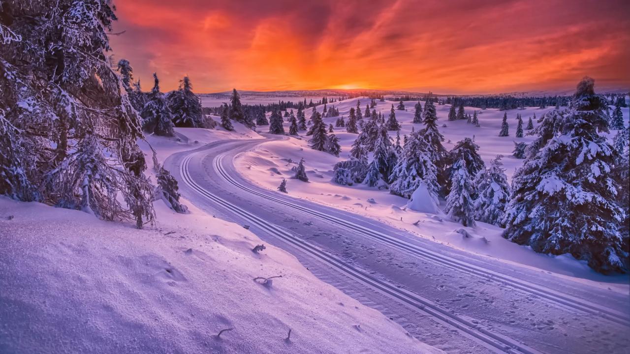 Wallpaper Sunset on a winter road in Norway
