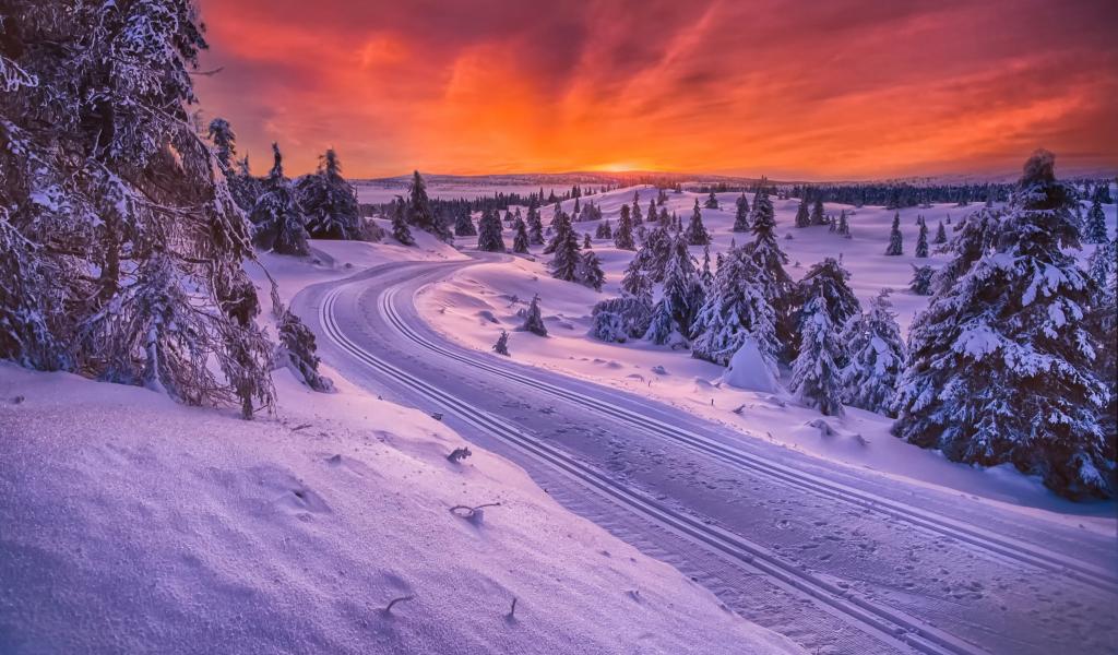 Wallpaper Sunset on a winter road in Norway