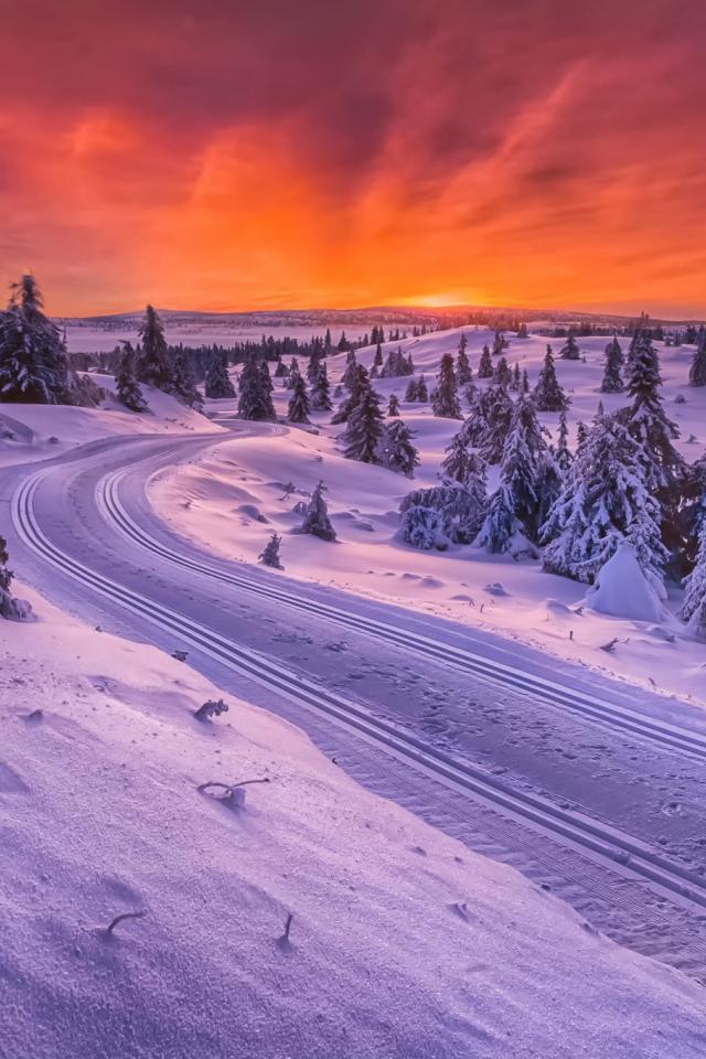 Wallpaper Sunset on a winter road in Norway