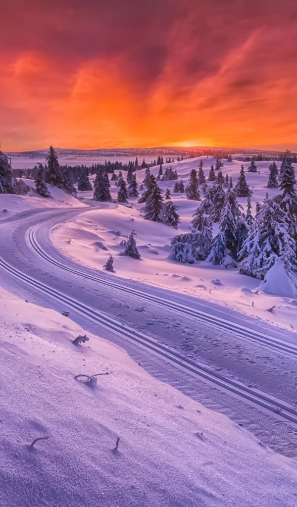 Wallpaper Snow, Road, Winter night, Sun, Moon, Stars, Winter road