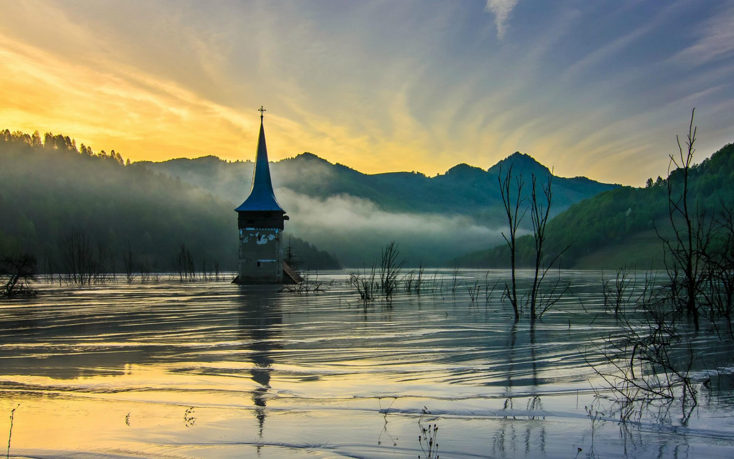 Wallpaper Flooded church at dawn. Romania