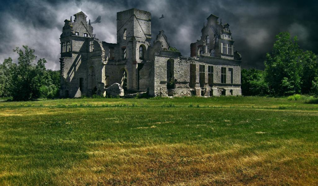 Wallpaper Crows fly over the ruins of a castle in Scotland